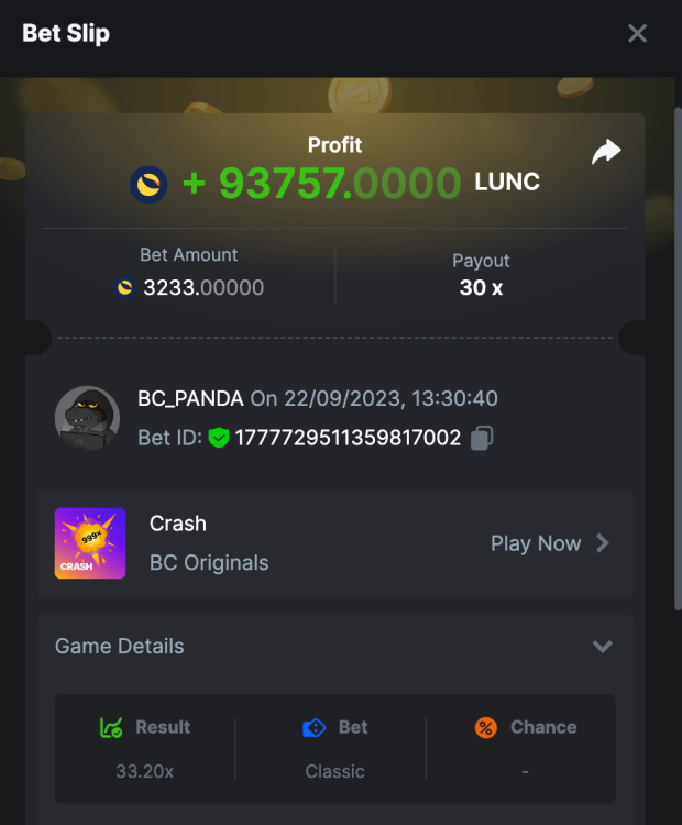 11. $5k Prestige Crash Challenge #107 DURATION: 22nd SEP - 29th SEP 13:20 pm UTC Dear esteemed VIP members, it's our pleasure to welcome you once again for an exhilarating week of contests and fervor from 22nd September to 29th September. Gear up for the much-awaited Prestige Challenge, a platform to showcase and push your Crash skills to the pinnacle. The focus of this week's tournament is on attaining the top multipliers, guaranteeing a heart-racing encounter unlike any other. The rules are clear-cut, and with a prize pool that's too tempting to resist, be assured that the competition is fiercer than ever. Let's dive into this remarkable challenge without any further ado. Kindly peruse the attached terms and conditions with utmost diligence. What's the Challenge? Win the highest multiplier you can on BC.Game's in-house game, Crash. If there is a tie, the player with the higher average bet amount (in USD) shall be the winner. If there is a tie in the amount and payout, the one who posted or edited his post first will be considered in the Ranking. How to Enter To enter, copy the link of the bet you'd like to submit. Once you've copied it, paste it as a reply to this thread like so: Link: https://bc.game/#/sd/11IMVWRRUCY1XZ In the same post, upload a screenshot of your win by clicking the game ID WITH VIEW IN USD mode ENABLED (accessible at the bottom of dropdown menu for your wallet up top. This way, we can ensure that your bet indeed met the minimum requirement at the time of placing it: Link: https://bc.game/#/sd/11IMVWRRUCY1XZ Minimum VIP Minimum VIP 4 with phone verified will be eligible! Minimum Payouts Minimum payout to qualify is 20x Minimum Bet Size $0.2 USD equivalent Eligible Coins All cryptocurrencies are eligible (excepting JB) Available Prizes GENERAL TERMS Please combine all of your hits together in a SINGLE post. Edit your existing post for additional hits, don't create a new post. Each eligible entry must have the Bet Slip URL, failure to include it will disqualify participation in the event. Bet Slip image is not mandatory. Bets must be posted within 24 hours of placing bet in order to keep things fair for everyone. Bets must be made during the specified time window stated above. This thread will lock automatically when the time period is over. One (1) entry per household. Anyone found attempting to win multiple prizes will be disqualified from this challenge as well as all future challenges. Failure to follow instructions will result in your submission being null and void. By entering this challenge, you acknowledge that BC.Game has the final decision on results and placement. Payouts will be distributed after the event is finished. Please note that it could take anywhere between 24 hours to 7 days after the completion of the event.