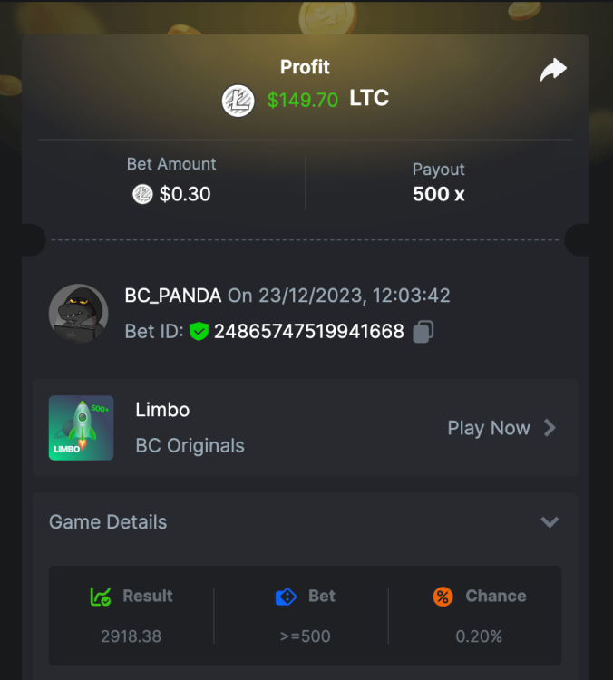8. $10k HOLIDAY SPECIAL PRESTIGE CHALLENGE DURATION: 23rd December – 2nd January, 08:30 am UTC Celebrate the festive season with BC.GAME's "Christmas & New Year Special Prestige Challenge"! Dive into the holiday spirit with our exciting lineup of games: Crash, Limbo, Hash Dice, and Classic Dice. This special event is your chance to end the year on a high note and ring in the new year with spectacular wins! Join us on a festive gaming spree where the excitement never ends. Challenge yourself in any of our four featured games and aim for the highest multipliers. It's a holiday extravaganza with a competitive twist! What's the Challenge? Achieve the highest multiplier possible in our exclusive games: Crash | Limbo | Classic Dice | Hash Dice In the event of a tie, the winner will be determined by the higher average bet amount (in USD). Should there be a tie in both the amount and payout, priority in the ranking will be given to the player who first posted or edited their entry. How to Enter To enter, copy the link to the bet you'd like to submit. Once you've copied it, paste it as a reply to this thread, like so: Link: https://bc.game/#/sd/11OYP94GH5IXXJ In the same post, upload a screenshot of your win by clicking the game ID WITH VIEW IN USD mode ENABLED (accessible at the bottom of the drop-down menu for your wallet up top). This way, we can ensure that your bet indeed meets the minimum requirement at the time of placing it: Minimum VIP A minimum of Level VIP 4 with phone verified will be eligible! Minimum Payouts The minimum payout to qualify is 20x Minimum Bet Size $0.30 USD equivalent Eligible Coins All cryptocurrencies are eligible (excepting JB) Available Prizes GENERAL TERMS Please combine all of your hits into a single post. Edit your existing post for additional hits; don't create a new post. Each eligible entry must have the Bet Slip URL; failure to include it will disqualify participation in the event. The Bet Slip image is not mandatory. Bets must be posted within 24 hours of placing the bet in order to keep things fair for everyone. Bets must be made during the specified time window stated above. This thread will lock automatically when the time period is over. One (1) entry per household. Anyone found attempting to win multiple prizes will be disqualified from this challenge as well as all future challenges. Failure to follow the instructions will result in your submission being null and void. By entering this challenge, you acknowledge that BC.Game has the final say on results and placement. Payouts will be distributed after the event is finished. Please note that it could take anywhere from 24 hours to 7 days after the completion of the event.
