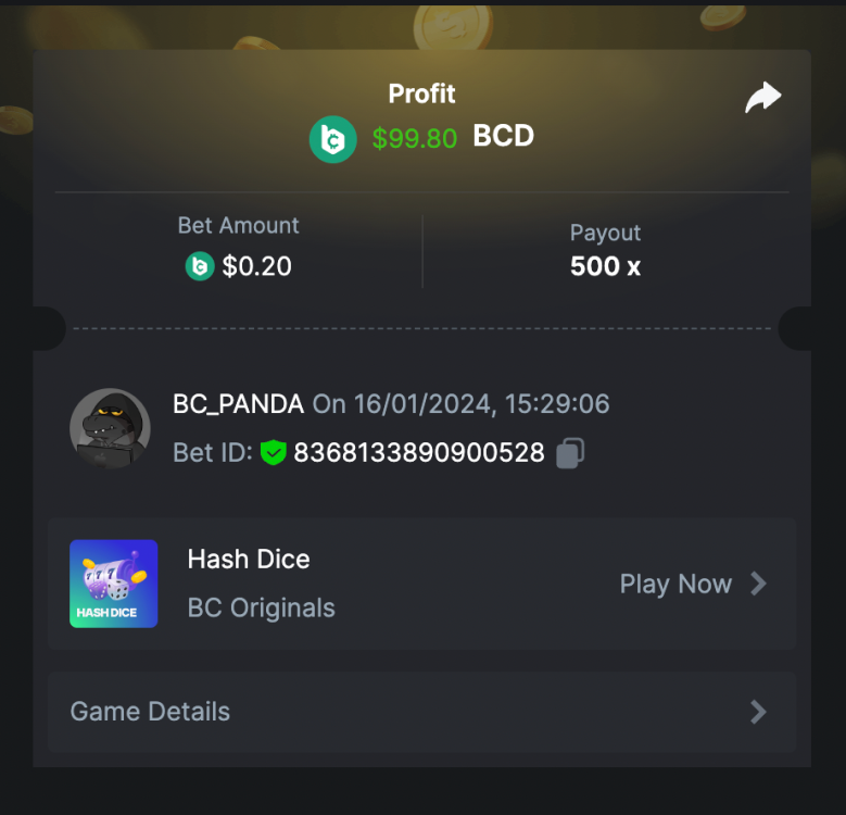 14. $5k Prestige Ultimate Dice Challenge #104 DURATION: 1st SEP - 8th SEP 13:20 pm UTC Greetings, BC.Game enthusiasts! The thrill of rolling the dice just got even more exhilarating! Dive into the "$5k Prestige Ultimate Dice Challenge #104", a spectacular arena where precision meets luck, and stand a chance to bask in glory and rewards. Running from 1st September to 8th September, this is your golden opportunity to showcase your prowess in Ultimate Dice and share a grand prize pool worth $5,000! Whether you're a seasoned player or just looking for a new challenge, this week promises unforgettable excitement and potentially handsome rewards. So, gear up, aim for those multipliers, and may fortune favor your rolls! Let's roll to victory! What's the Challenge? Complete as many of the following 20 multipliers on our in-house Ultimate Dice. Must be a winning bet. | 11x | 22x | 33x | 44x | 55x | 66x | 76.7441x | 87.6106x | 99x | 150x | 220x | 300x | 396x | 550x | 825x | 900x | 1100x | 2475x | 3300x | 4950x | Each multiplier you hit above counts as 1 point (Maximum 1 point for each multiplier). If there is a tie, the player with the higher average bet amount (in USD) shall be the winner. How to Enter To enter, copy the link of the bet you'd like to submit. Once you've copied it, paste it as a reply to this thread like so: Link: https://bc.game/#/sd/11H78LROL96057 In the same post, upload a screenshot of your win by clicking the game ID WITH VIEW IN USD mode ENABLED (accessible at the bottom of dropdown menu for your wallet up top. This way, we can ensure that your bet indeed met the minimum requirement at the time of placing it: Link: https://bc.game/#/sd/11H78LROL96057 Minimum VIP Minimum VIP 4 with phone verified will be eligible! Minimum Payouts Hit at least 4 payouts to qualify Minimum Bet Size $0.15 USD equivalent Eligible Coins All cryptocurrencies are eligible (excepting JB, and BCL) Available Prizes GENERAL TERMS Please combine all of your hits together in a SINGLE post. Edit your existing post for additional hits, don't create a new post. Bets must be posted within 24 hours of placing bet in order to keep things fair for everyone. Bets must be made during the specified time window stated above. This thread will lock automatically when the time period is over. One (1) entry per household. Anyone found attempting to win multiple prizes will be disqualified from this challenge as well as all future challenges. Failure to follow instructions will result in your submission being null and void. By entering this challenge, you acknowledge that BC.Game has the final decision on results and placement. Payouts will be distributed after the event is finished. Please note that it could take anywhere between 24 hours to 7 days after the completion of the event.