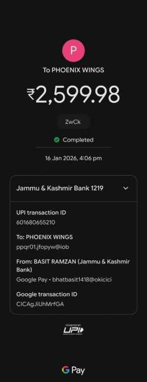 2. User ID: 18082229 Amount Paid: ₹2,599.98 (Google Pay) Amount Requested in App: ₹2,600.00 Date/Time: Jan 16, 2026 at 4:06 PM UPI Ref ID: 601680655210 Order ID: F-1854469339571698519 The Issue: When I scanned the QR code, the amount automatically adjusted to ₹2,599.98 on Google Pay. The payment was successful (see attached screenshot), but BC.Game marked it as "Failed." It has been 13 days and my support ticket (#9705839) was closed without a credit. Please manually credit the ₹2,599.98 to my account.