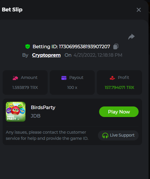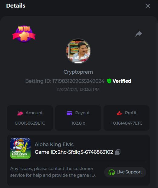 Betting ID: 1719831209635249024 Aloha king elvis 102.80x Betting ID: 1719854577341462535 Candy Monsta 134.25x -