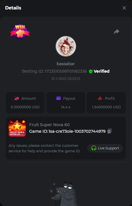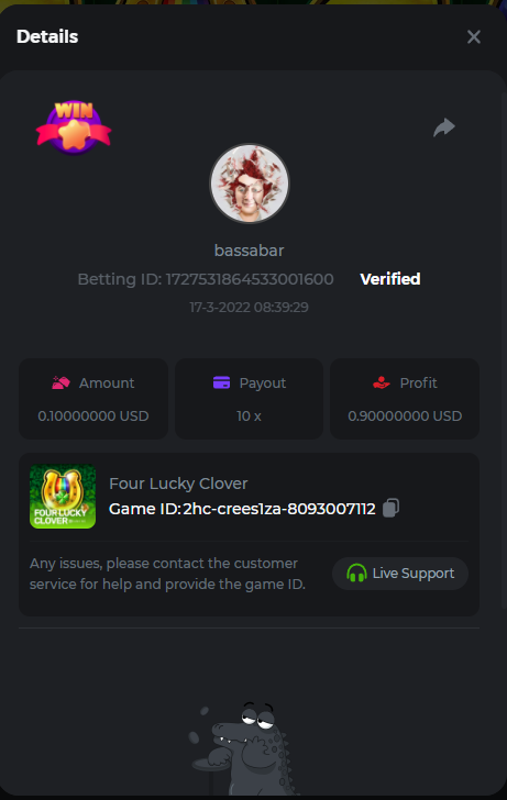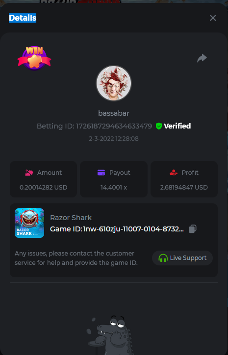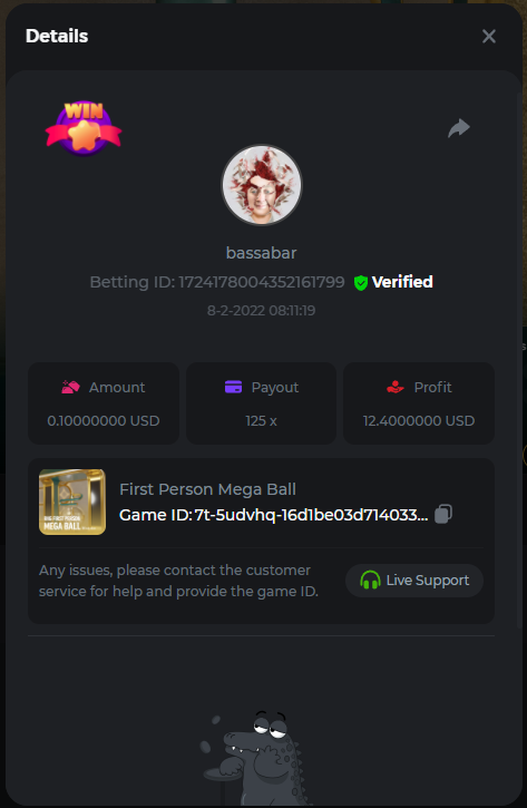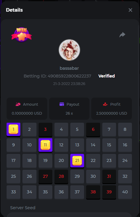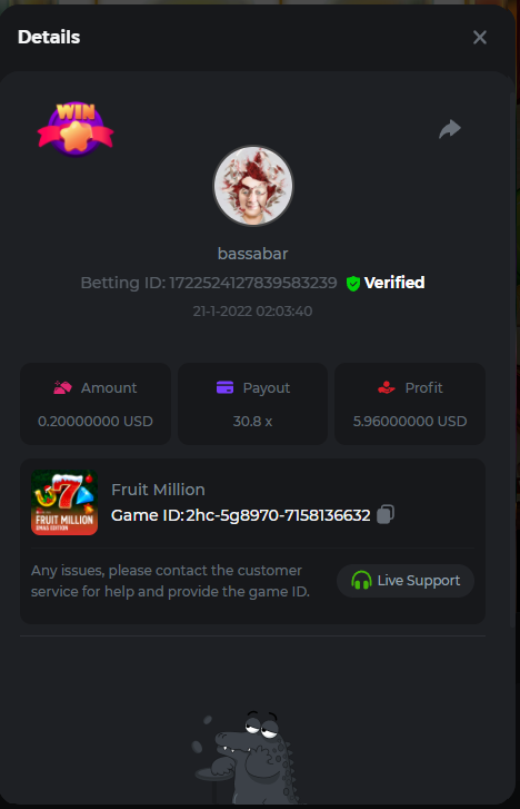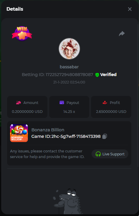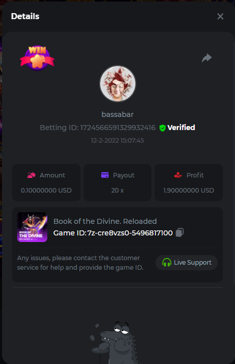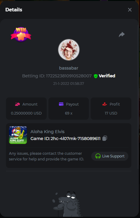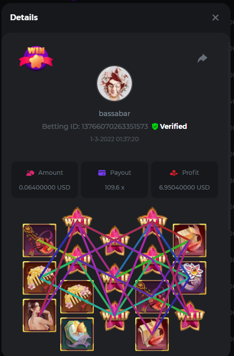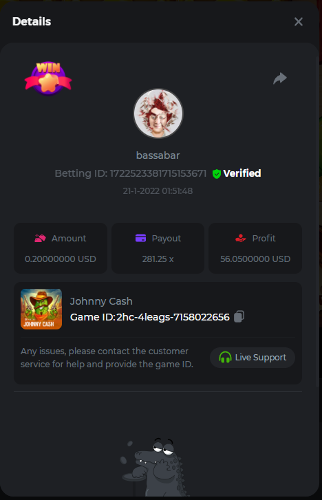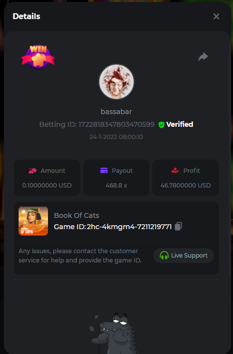 22. Book Of Cats Multiplier: 468.8 Betting ID: 17226818347803470599 Bonanza Billion Multiplier: 14.25x Betting ID: 1722527294808878087 Fruit Million Multiplier: 30.8x Betting ID: 1722524127839583239 Johnny Cash Multiplier: 281.25x Betting ID: 1722523381715153671 Aloha King Elvis Multiplier: 69x Betting ID: 1722523810910528007