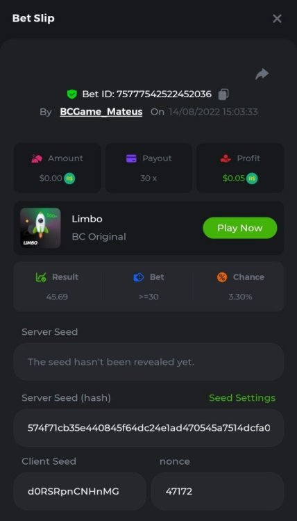 Brazil Flash Event Limbo Termina: 05, Julho 20:59 -3 UTC "Event restricted to users from the Portuguese Community" Vamos explorar o universo com o foguete Limbo. Um foguete não voará a menos que alguém acenda o fusível, para isso vocês precisam completar o maior número de multiplicadores exatos. A galáxia inteira é sua e uma parte do prêmio total de 250 BRL também pode ser sua. Lembre-se: o céu não é o limite, há pegadas na lua Qual é o desafio? Complete o máximo dos 30 pagamentos a seguir em nosso Limbo interno . Deve ser um multiplicador exato. | 20x | 30x | 45x | 55x | 60x | 65x | 70x | 90x | 120x | 200x | 250x | 300x | 400x | 450x | 550x | 700x | 825x | 900x | 1000x | 1200x | 1500x | 2000x | 2500x | 3000x | 4000x | 5000x | 6000x | 7000x | 8000x | 9000x | 10000x | Cada pagamento que você acertar acima conta como 1 ponto (máximo de 1 ponto para cada pagamento). Se houver empate, o jogador com o maior valor médio de aposta (em BRL) será o vencedor. Se houver empate no valor e no pagamento, será considerado no Ranking aquele que postou ou editou seu post primeiro. VIP mínimo Não há nível VIP mínimo Pagamentos mínimos Acerte pelo menos 3 pagamentos para se qualificar Aposta Mínima Equivalente a 0.001 BRL Coins elegíveis Todas as criptomoedas são elegíveis (exceto JB) Prêmios disponíveis 1º lugar ....... 8$ 2º lugar ....... 6$ 3º Lugar ....... 3$ 4º Lugar ....... 2$ 5º Lugar ....... 1$ Os pagamentos serão realizados em BRL de acordo com a TAXA DE CÂMBIO da data do pagamento! Como participar: Para participar, copie o link da aposta que deseja enviar. Depois de copiá-lo, cole-o como resposta a este tópico da seguinte forma: Link: https://bc.game/sd/?sd=10QUOJE1NMVTOZ Na mesma postagem, faça upload de uma captura de tela de sua vitória clicando no ID do jogo COM VISUALIZAÇÃO no modo BRL ATIVADO (acessível na parte inferior do menu suspenso da sua carteira na parte superior. Dessa forma, podemos garantir que sua aposta realmente atendeu ao requisito mínimo no momento da colocação: Link: https://bc.game/sd/?sd=10QUOJE1NMVTOZ Por favor, combine todos os seus hits em um ÚNICO post. Edite sua postagem existente para obter hits adicionais, não crie uma nova postagem. As apostas devem ser postadas dentro de 24 horas após a colocação da aposta para manter as coisas justas para todos. As apostas devem ser feitas durante a janela de tempo especificada acima. Este encadeamento será bloqueado automaticamente quando o período de tempo terminar. Uma (1) entrada por família. Qualquer pessoa encontrada tentando ganhar vários prêmios será desqualificada deste desafio, bem como de todos Boa sorte!