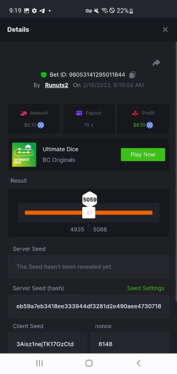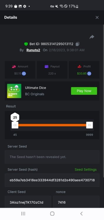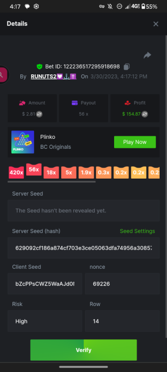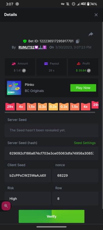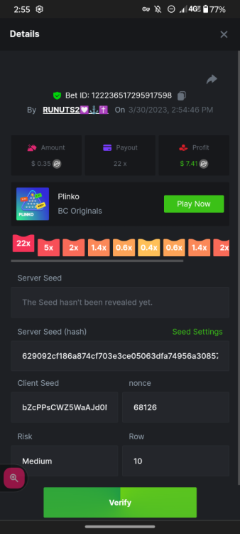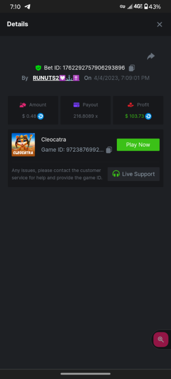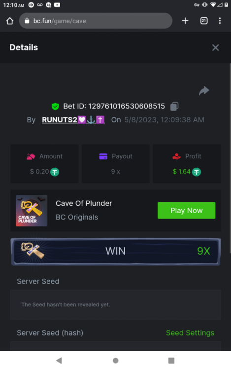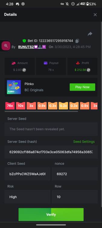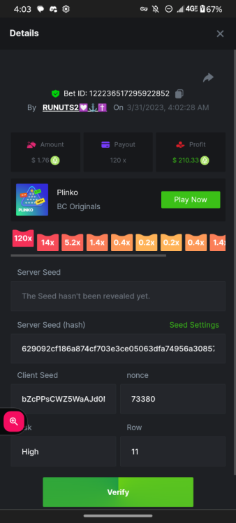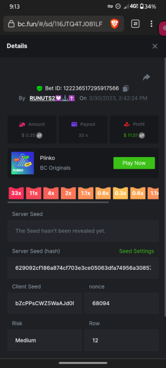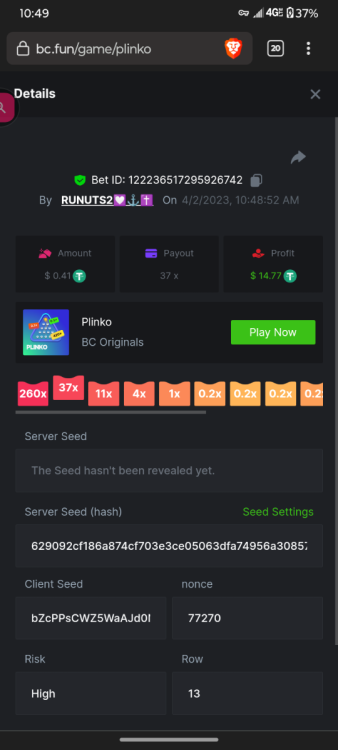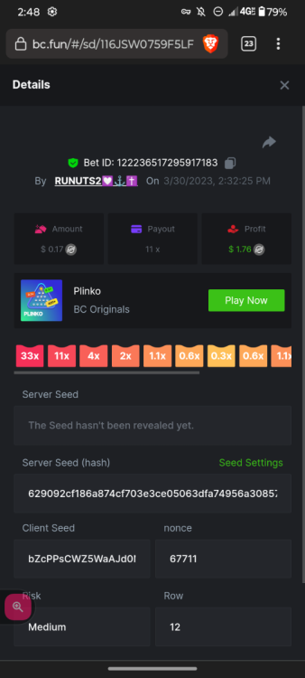 1. 16x | 26x | 27x | 29x | 33x | 37x | 43x | 56x | 58x | 76x | 83x | 88x | 110x | 120x | 130x | 170x | 260x | 420x | 620x | 1000x Some bets say 09 cents but showed $0.1 when I did the bet https://bc.game/#/sd/11FZ13ER2KDUZR https://bc.game/#/sd/11FZ1O7RLXAK9Z https://bc.game/#/sd/11FZ20E4G643PN https://bc.game/#/sd/11FZ2B9RQX25LV https://bc.game/#/sd/11G65L0NGEB7PN