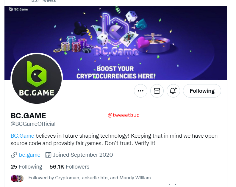 Easy Twitter follow - Yes Username : @tweeetbud Twitter handle : @tweeetbud Link to retweet: 2FA is activated sports Ticked ID: 2127057070908908009 Medium sports Ticket ID: 2127051913961812711 Roulette https://bc.game/sd/?sd=10ICVN47TJDL3N PLINKO https://bc.game/sd/?sd=10ICVT5IVHP79V KENO https://bc.game/sd/?sd=10ICW2REPWTB83 HARD WHEEL: https://bc.game/sd/?sd=10ICX8GN0PTHJN