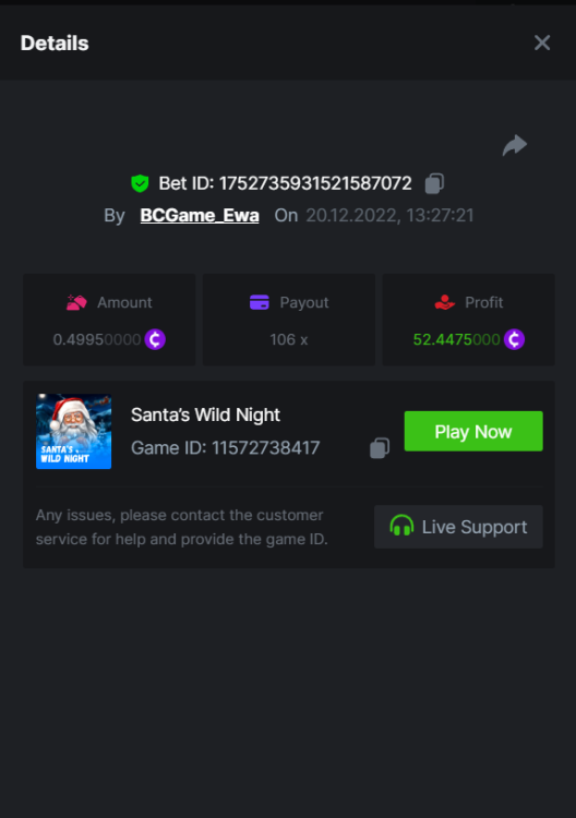 12. $5,000 FIND WANTED LETTERS AND SAVE XMAS – MINES CHALLENGE Starts: 19, December 08:00 am GMT Ends: 26, December 08:00 am GMT Hey Everyone! Christmas is coming and we want to invite you to our Christmas Hunt. Help us save Xmas and take gifts from Santa bag. We are giving away $5,000 in prizes for all qualified participants. So head over to the Mines game page and get started! – (Check all the conditions of participation below). What's the Challenge? Find all letters from word ‚XMAS’ on Mines game using below mentioned settings: for ‘X’ - 9 diamonds 8 mines, payout 83.1985x for ‘M’ - 16 diamonds 4 mines, payout 99.3842x for ‘A’ - 12 diamonds 6 mines, payout 102.1699x for ‘S’ - 9 diamonds 9 mines, payout 176.8013x Only players who post all 4 bets with exact the same settings as on below screenshots will win prizes. How to Enter To enter, copy the link of the bet you'd like to submit. Once you've copied it, paste it as a reply to this thread like so: Link: https://bc.game/#/sd/10YWJXCLX823GZ In the same post, upload a screenshot of your win by clicking the game ID WITH VIEW IN USD mode ENABLED (accessible at the bottom of dropdown menu for your wallet up top. This way, we can ensure that your bet indeed met the minimum requirement at the time of placing it: Link: https://bc.game/#/sd/10YWJXCLX823GZ Link: https://bc.game/#/sd/10YWK6WJG1YFBN Link: https://bc.game/#/sd/10YWLNKDX4QIVN Link: https://bc.game/#/sd/10YWMF6CJCR95F Minimum VIP Minimum VIP 4 Minimum Payouts Need to find all 4 letters with mentioned payouts for each. Minimum Bet Size $0.2 USD equivalent Eligible Coins All cryptocurrencies are eligible (excepting JB) Prize pool & Reward Breakdown Each particpant who find correcly all 4 letters from word 'XMAS' will receive EQUAL reward from prize pool as below: Please combine all of your hits together in a SINGLE post. Edit your existing post for additional hits, don't create a new post. Each eligible entry must have the Bet Slip URL, failure to include it will disqualify participation in the event. Bet Slip image is not mandatory. Bets must be posted within 24 hours of placing bet in order to keep things fair for everyone. Bets must be made during the specified time window stated above. This thread will lock automatically when the time period is over. One (1) entry per household. Anyone found attempting to win multiple prizes will be disqualified from this challenge as well as all future challenges. Failure to follow instructions will result in your submission being null and void. By entering this challenge, you acknowledge that BC.Game has the final decision on results and placement. Payouts will be distributed after the event is finished. Please note that it could take up to 48 hours after the completion of the event. Good luck everyone! Merry Christmas!