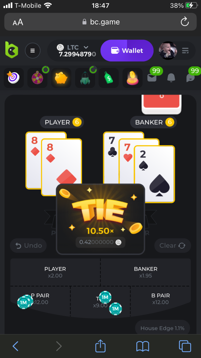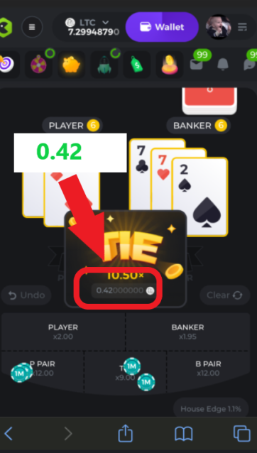 You bet 0.02 LTC for player pair and 0.02 on tie.