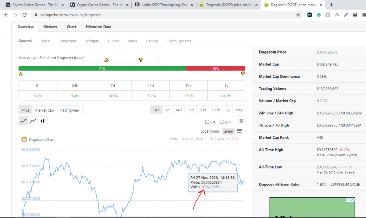 Was using coingecko as advised by bcgame support too, to check the doge price in usd. Below is a quick snapshot for easy reference.
