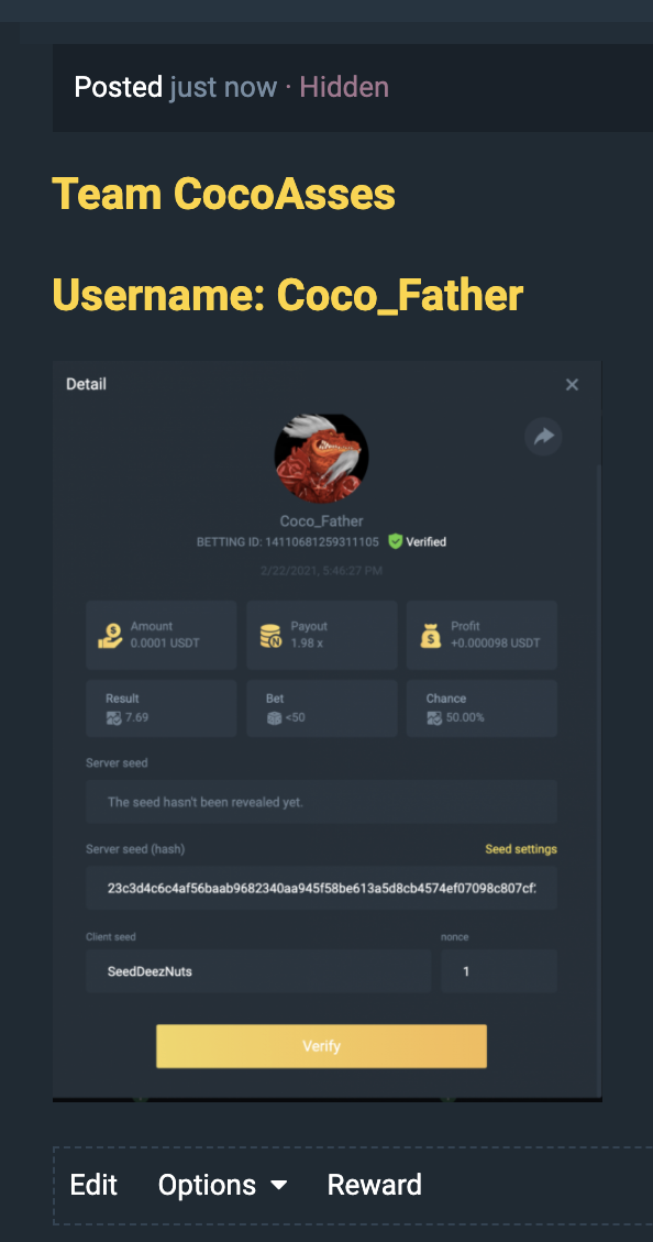 Coco_Father Posted February 23, 2021 Share Posted February 23, 2021 Dice Battle Royale Trios; Elimination Rounds Top Prize $1000 - March 1st Till Only One Team Remains Standing ($0.10 Minimum Bet) Description Players will compete in teams of 3 Teams will earn points by rolling specific numbers chosen by the event host Check back here each day to discover the new Lucky Number At the end of each round the team(s) with the least amount of points will be eliminated The last team standing wins the grand prize Points Details At the start of each round the event host will choose the lucky number(s) That exact number must be rolled to earn points The amount of points earned will be the same as the payout multiplier of that bet rounded down to the nearest 10th Example: The lucky number is “10.09” The player sets their dice slider to target under “44.00” The payout multiplier for under 44 is 2.25x The player would earn 2.2 points for their team The minimum is 1.3 points. Anything less will not be added to the team’s score 5 bonus points will be added to the team score for direct hits (the player’s target is 0.1 away from the lucky number) Example: The lucky number is “99.50” A direct hit would be to set the dice slider to target “over 99.40” or “under 99.60” How To Enter Your must choose your teammates before the first round starts Comment on this post with the names of your two teammates and team name. (each teammate must do this) You must choose a team name (you can not change this once the event starts) All event related posts must have your team name at the top (this will make it easier to keep score) How To Post Your Scores Each team member will create only one post per round with their individual scores Post a screenshot of your bet detail To add more bets you may edit your post The thread will be locked between rounds while the points are tallied If you do not post your bets before the thread is locked at the end of each round they will not be added to your score (be sure to get them in on time) You must have your team name at the top of your post (see image below) You must follow this format or your bets will not count towards your score (see image below) Please shrink the size of your screenshots. You can do that by double clicking it on PC or long pressing on mobile. After each round check the reply under this post to see if you made it to the next round. If not your name will be crossed out. Rules You may only join one team. Minimum bet is $0.10 in any coin. No JB Coin. When we catch you using multiple accounts you will be banned from this and all future events and your points will be removed from all teams. No Spamming this thread. Keep it clean and organized so I can focus on counting points and giving out rewards. Please. Tell Coco he is beautiful. Twice. No changing your username during the event. Your BC.Game username must be the same as your forum username. Nag DigiDash for Shitcodes. Also twice. Remember, this is for fun and entertainment. So have fun and be entertained. Good Luck! The BC.Game Team Link to comment Share on other sites More sharing options...