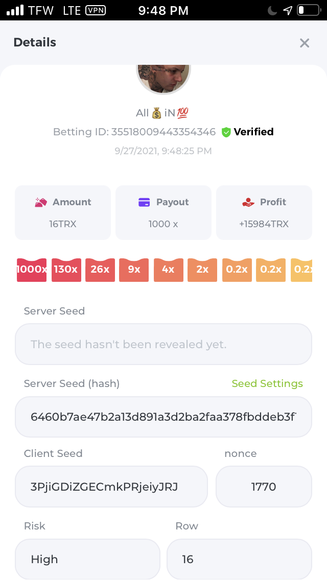 I hit 1000x on plinko high risk 16th level. Betting 16 Trx ending up being a win over $1,000. I literally gave $500+ in tips and rain right back into bc chat. Coco I think this one should be big enough to be on ur radar lol.