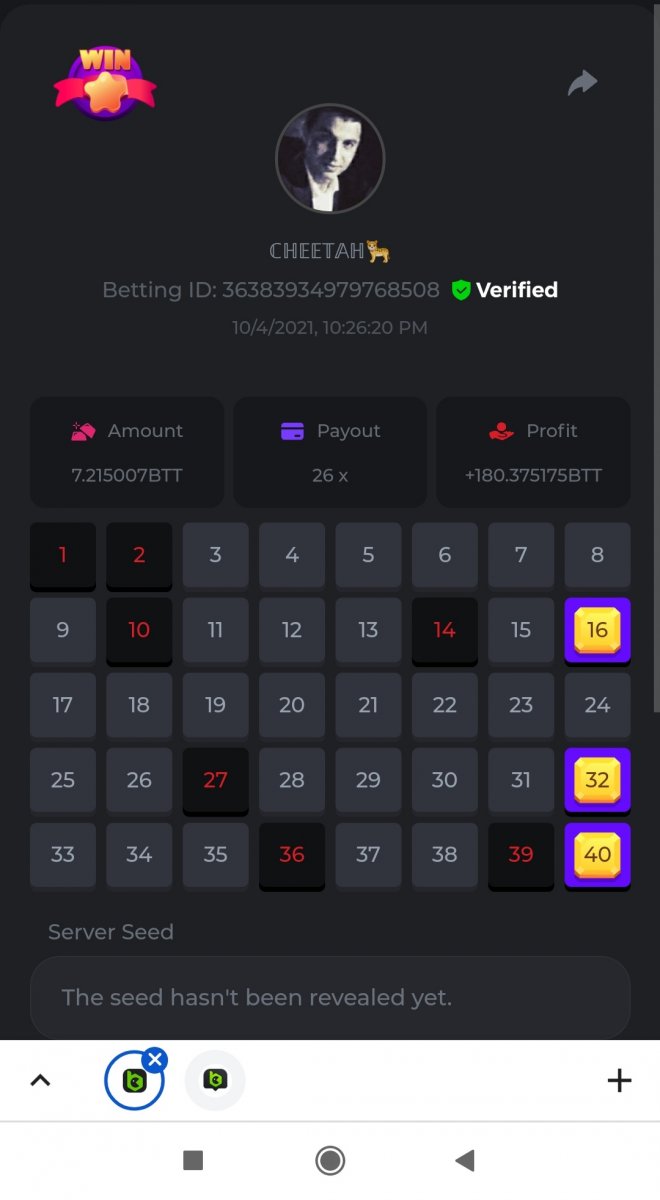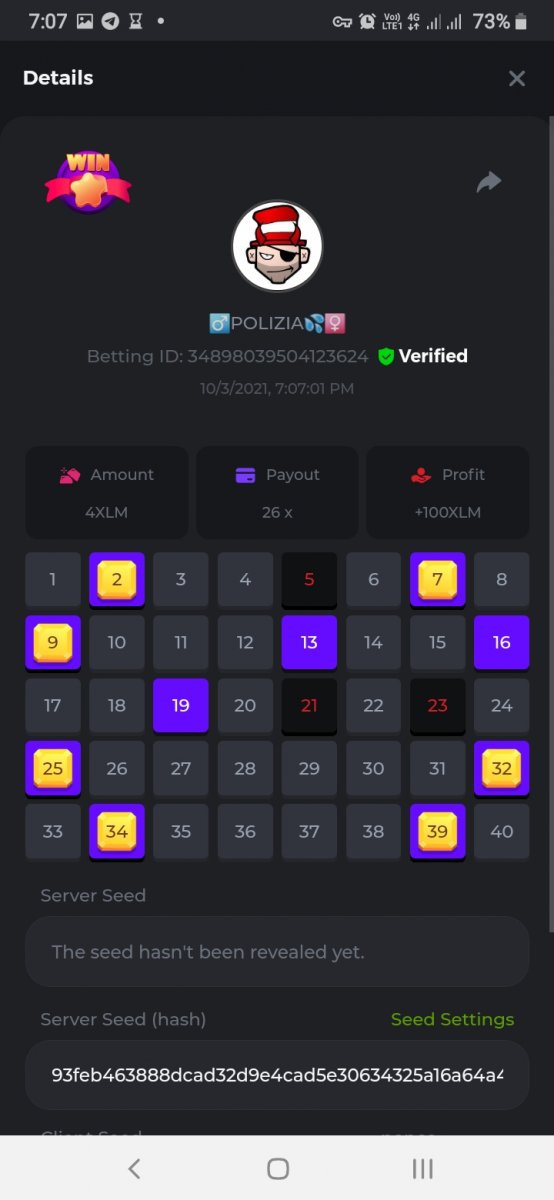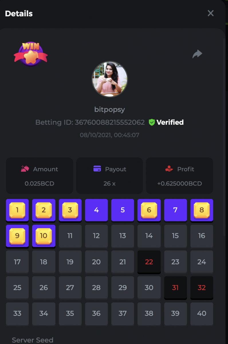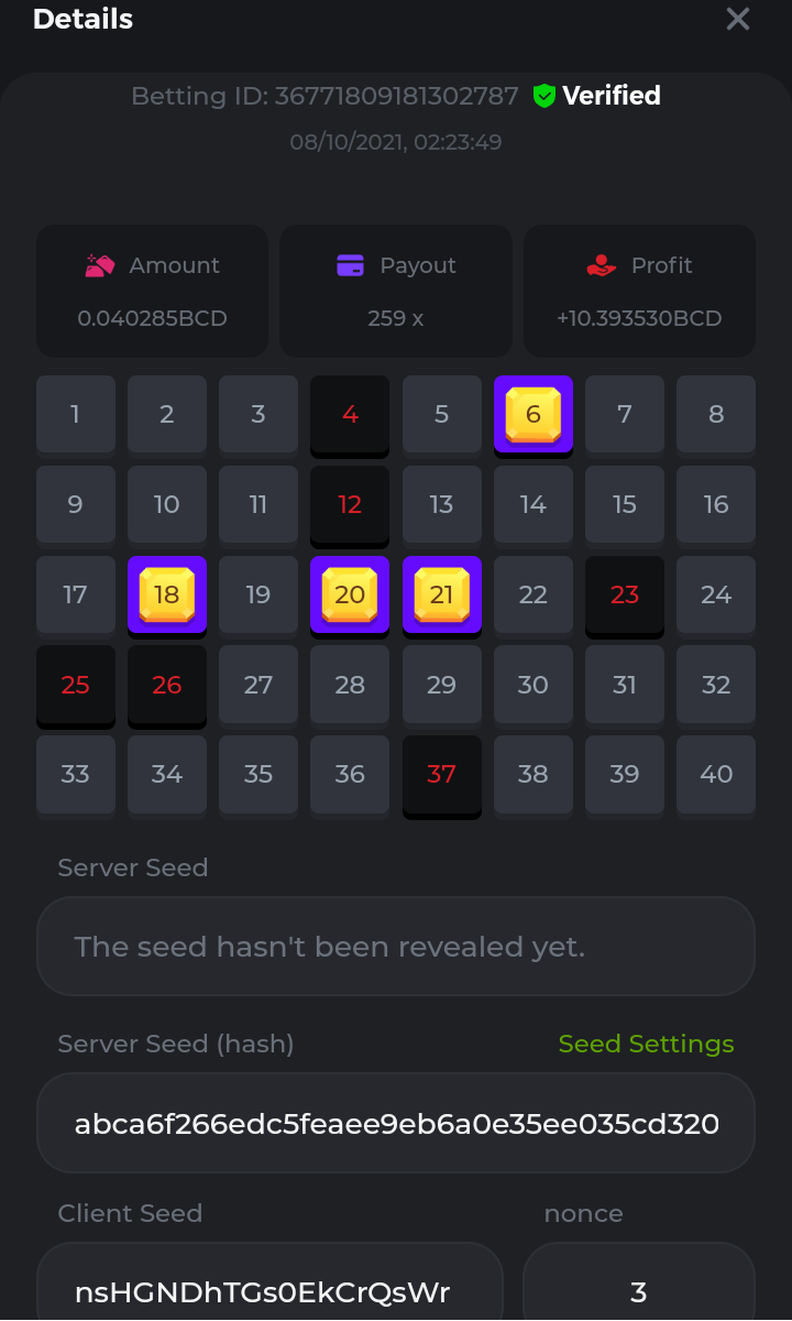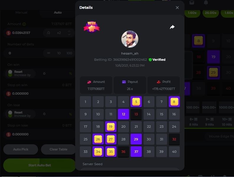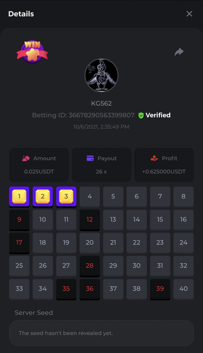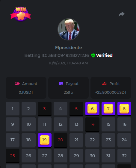 WOUNDED Posted October 4, 2021 Share Posted October 4, 2021 Welcome to keno single challeng In addition to the Top challenge,we also prepared a small challenge We hope you enjoy it Starts: 23:00 , 4 october CMT Ends: 23:00 , 8 october CMT What's the Challenge? Complete as many of the following 3 payouts on keno single(1 or all payouts) 26X _ 1 points 100X _ 3 points 259X _ 5 points The payouts must be EXACT hits - if you can't find a payout,try changing the risk level to medium or high Minimum VIP Tier Must be VIP4 or higher in order to enter this challenge. Minimum Bet Size $0.025 USD equivalent (please check the individual coin amounts below) - Bets made below this amount will not count Eligible Coins All coins are eligible (excluding JB) Available Prizes (single payout) 1points......$2 for 5 Winner 3 points......$3 for 5 Winner 5 points......$4 for 5 Winner Available Prizes (combined payout) 4 points......$6 6 points......$11 8 points......$16 9 points......$22 (For example,26X & 100X have 4 points) To enter,copy the bet ID of the bet you'd Once you've copied it,post it as a reply to this thread like so: Betting ID: 36383934979768508 In the same post,upload a screenshot of your win by clicking the game ID WITH VIEW IN USD mode ENABLED (accessible at the bottom of dropdown menu for your wallet up top.This way,we can ensure that your bet indeed met the minimum requirement at the time of placing it Please combine all of your hits together in a SINGLE post.Edit,don't create a new post Bets must be posted within 24 hours of placing bet in order to keep things fair for everyone Bets must be made during the specified time window stated above. This thread will lock automatically when the time period is over Each user is only allowed with one account Otherwise,the wrongdoer will be dealt with Failure to follow instructions will result in your submission being null and void Payouts will be made within 48 hours of challenge completion,please be patient Let's go Good luck Link to comment Share on other sites More sharing options...